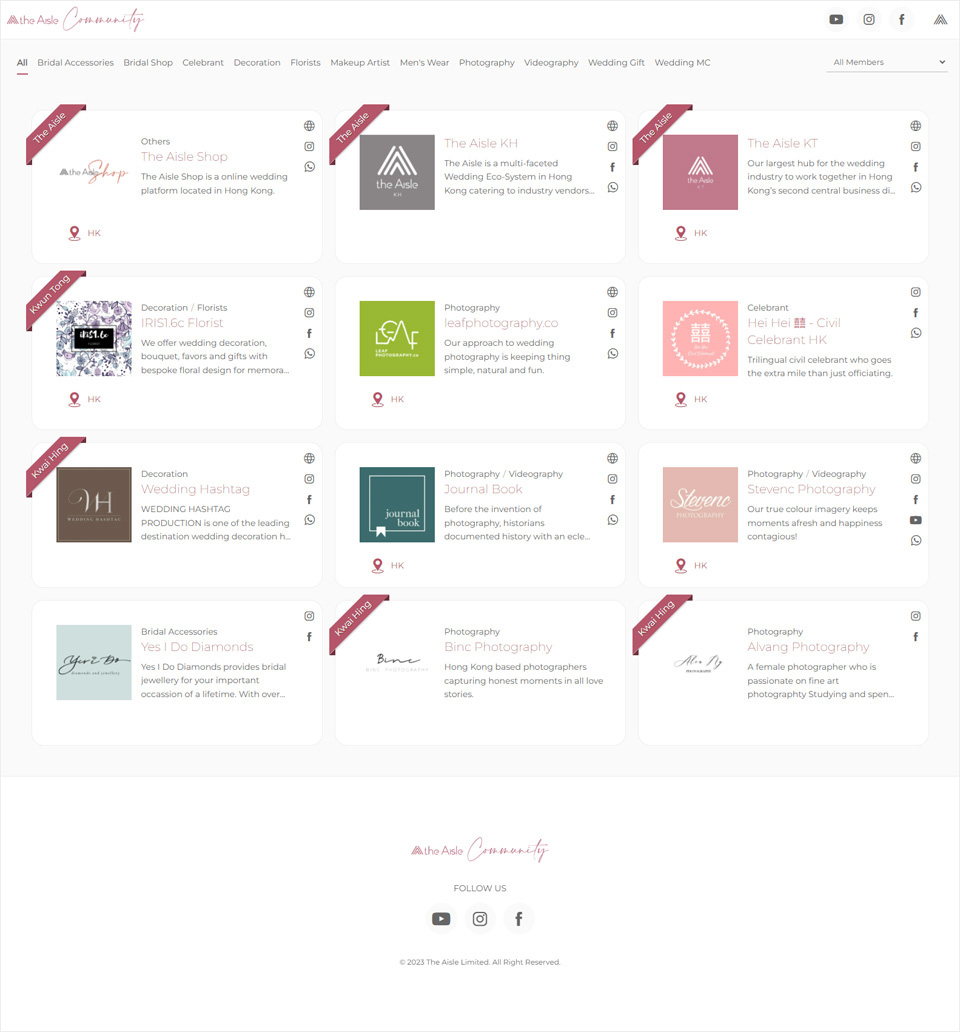 The Aisle is a multi-faceted Wedding Eco-System in Hong Kong catering to industry vendors and consumers. The Aisle started off as Hong Kong's first Wedding Industry co-working space, which brought together a wide range of talented vendors and provided them with a facility that fosters collaboration and innovation.